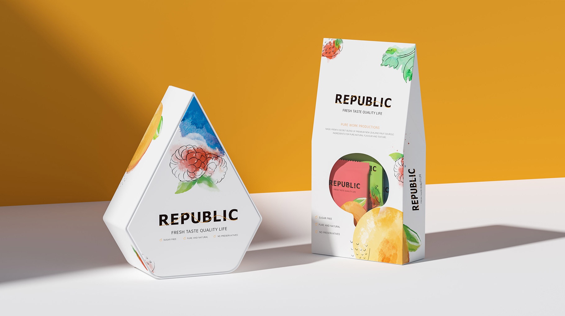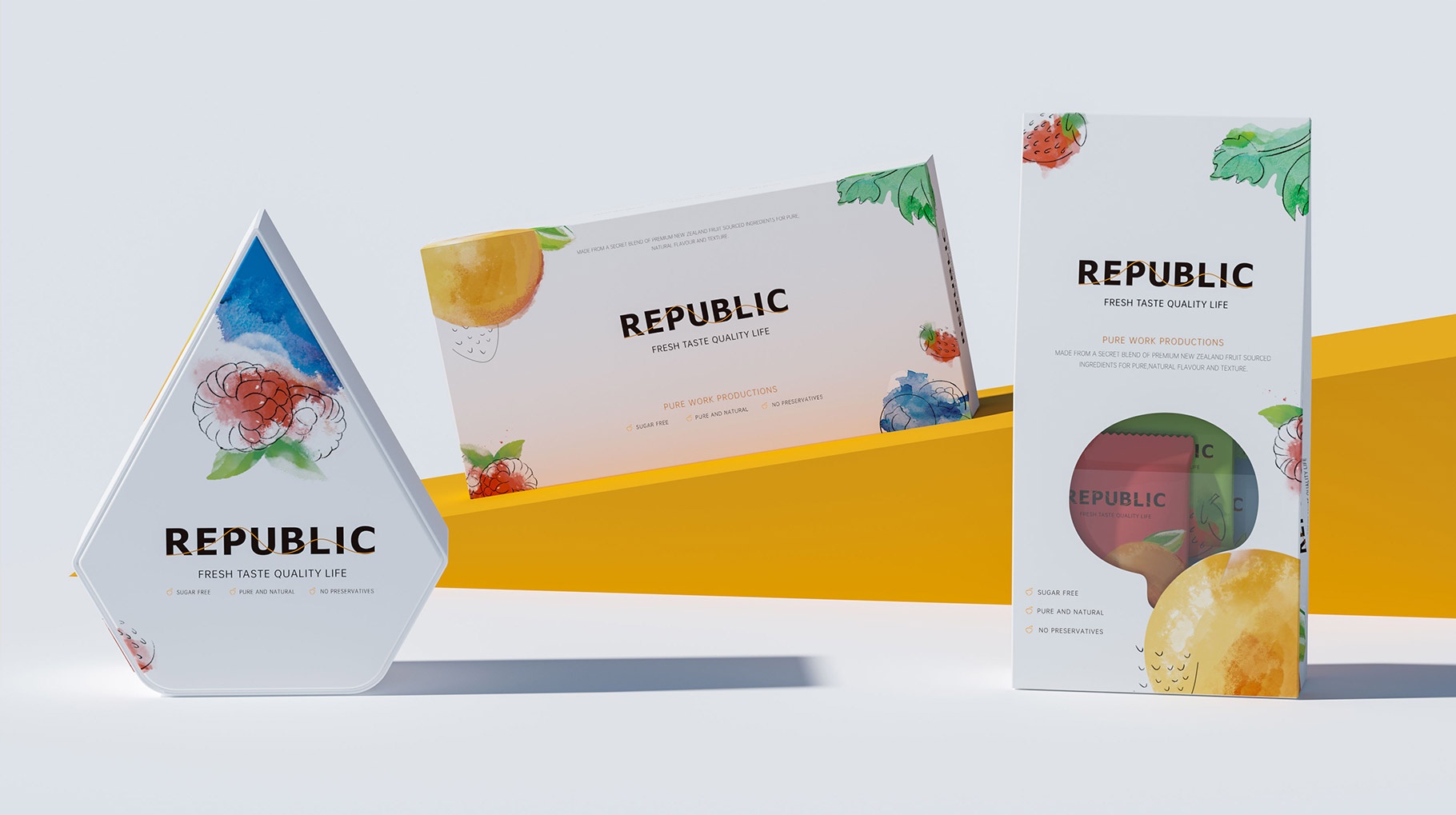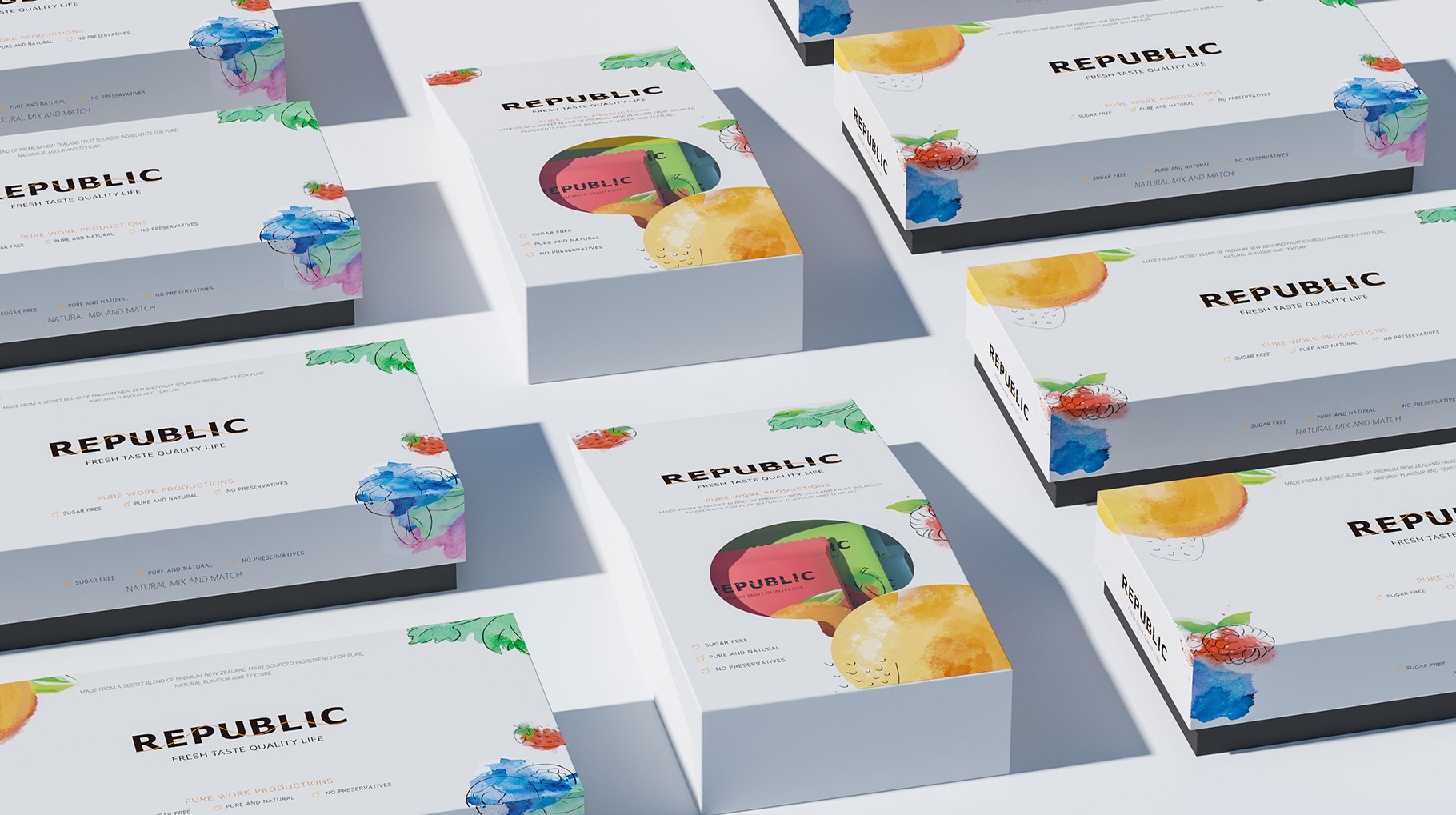 REPUBLIC水果味巧克力包裝設(shè)計(jì)以簡(jiǎn)約及時(shí)尚的設(shè)計(jì)風(fēng)格對(duì)產(chǎn)品進(jìn)行品牌包裝,區(qū)別市面上傳統(tǒng)的濃郁厚重的設(shè)計(jì)風(fēng)格,以水果結(jié)合水彩的表現(xiàn)手法,打造年輕化的產(chǎn)品體驗(yàn),為品牌再在消費(fèi)市場(chǎng)帶來(lái)耳目一新的視覺(jué)感官體驗(yàn)。